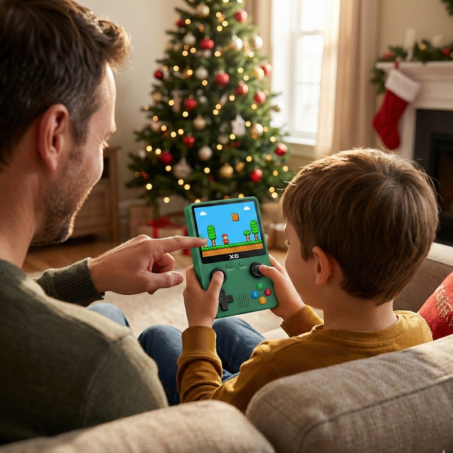 Una Consola GameMemories X6™ (varios colores a elegir), miles de juegos retro ya cargados, una funda rígida protectora a juego con la consola, Cable de carga USB, Manual de usuario (sencillo de usar)